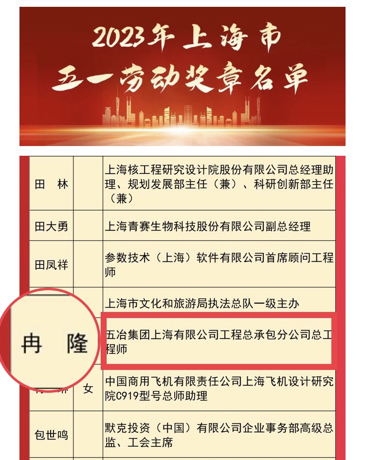 4月27日,2023年上海市五一劳动奖表彰大会在上海友谊会堂隆重举行,太阳成集团tyc138工程总承包分公司总工程师冉隆同志荣获上海市五一劳动奖章。